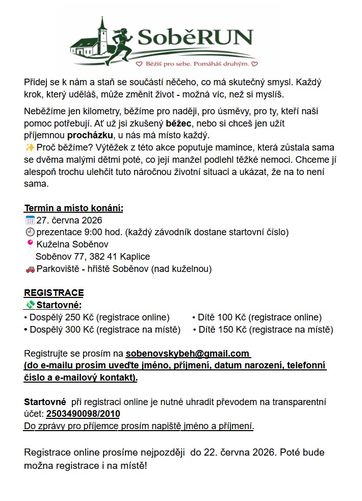 Od 18.2.2026 se vybírají poplatky za vývozy popelnice a ze psů. Poplatek za jeden vývoz popelnice v roce 2025 činí 66,-Kč s DPH/popelnice 110l a 120l, 144,-Kč s DPH/popelnice 240l, poplatek za psa se nemění a je dle OZV. Poplatky je možné uhradit přímo na OÚ Soběnov, nebo na účet obce. Upřednostňujeme úhrady místních poplatku přímo na účet obce po dohodě s pí.Muškovou na tel.:776762679, 608120962, která Vám sdělí částku k úhradě, Po a St 7:00-11:00, 14:00-17:00, Út a Čt 7:00-13:00, Pá 7:00-11:00. Číslo účtu obce Soběnov 0580013309/0800, jako variabilní symbol uvádějte vaše číslo popisné, zpráva pro příjemce uvést o jaký poplatek se jedná (vývoz popelnic+Jméno/poplatek za psa+Jméno).POZOR KAŽDÝ POPLATEK MUSÍ BÝT UHRAZEN SAMOSTATNĚ.